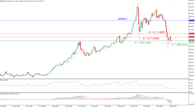 美伊双方就谈判可能各执一词, 伊朗代理人胡塞武装声称将控制曼德海峡,美伊局势再度紧张。受此影响,市场再度加大对美联储年内加息预期的押注,美元指数冲高,黄金日内下跌2.85%。黄金日线图,价格触及4600关口后遭遇大量抛售,昨日收出一根“大阴烛”,收盘险守第一支撑位4380。技术面看,RSI信号线与MACD量能柱均显示空头占据主导,后市价格仍存在下行压力。交易者短期以逢高做空策略为主,关注第一阻力位4500,下方关注第一支撑位4380的价格行为,若价格跌破该位置,则看向第二支撑位4300。