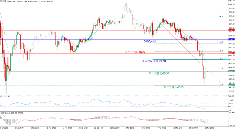 全球央行严阵以待应对能源价格飙升造成的通胀反弹,市场大幅押注各大央行年内的加息可能。交易员押注美联储年内加息的预期,美元指数强势上涨,黄金大幅下跌。黄金4H图,价格昨日收跌3.49%,连破4800/4700两道关口。技术面看,RSI信号线进入30以下超卖区,多头量能持续放大,该信号意味着黄金短线内出现超卖迹象,后市或出现一定程度价格反弹。交易者当前以逢高做空策略为主,关注第一支撑位4650,斐波那契回调位4780两道潜在回调位,下方关注第二支撑位4500。