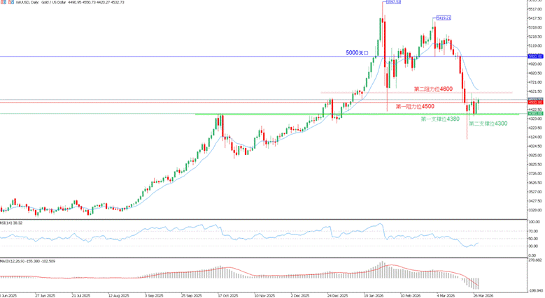 黄金:美伊局势持续升温,伊朗首都德黑兰周末遭遇空袭,美军地面部队即将进入中东。市场持续加注美联储年内加息预期,美债收益率大幅攀升,无风险资产利率上行,黄金承压向下,当前在4380位置找到多头防守支撑。技术面看,RSI信号线向上反弹,MACD空头量能微缩,金价下跌势头暂时得到缓解。后市关注4380-4600区间,价格或在此筑底反弹。【支撑位:4380/4300,阻力位:4500/4600】