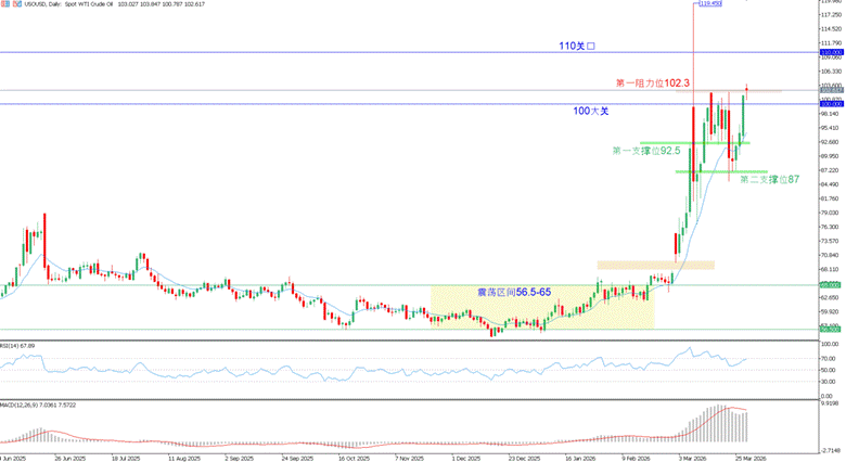 原油:伊朗或对霍尔木兹海峡通行船只收取过路费,俄罗斯自4月1日起禁止汽油出口,美国原油早盘跳空高开1%,报103.02美元/桶。本周持续关注霍尔木兹海峡的通航信号以及中东局势的最新发展来预判油价本周走势。整体看来,油价近期料将具备充足上行动能,本周关注100关口是否站稳以及第一阻力位102.30能否突破。【支撑位:100/92.50 阻力位:102.30/110】