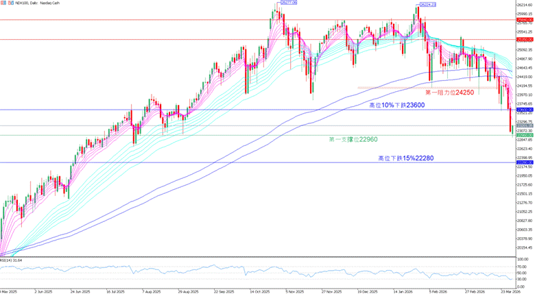 纳指100:油价飙升令交易员大幅押注美联储货币政策转向,特朗普屡次挑战现有国际秩序,引发资金从美国外流,美股三大股指全面下挫,纳指100自高位下跌12.6%。本周关注伊朗战争最新动向以及非农数据是否加剧加息预期,美股近期料持续承压,本周关注第一支撑位22960点以及高位下跌15%目标位22280点。【支撑位:22960/22280;阻力位:23600/24250】