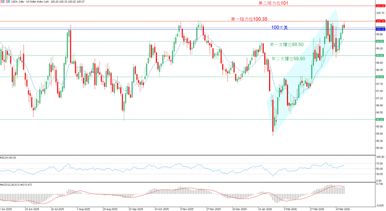 美元指数:中东乱局延续,美国向伊朗派遣地面部队,市场持续增加美联储年内加息预期,美元指数站上100大关。本周持续关注美伊是否达成缓战协议以及霍尔木兹海峡的通行情况,料美元在避险需求以及利率重新定价的背景下将维持强势,后市关注100大关以及100.35第一阻力位。【支撑位:100/99.50 阻力位:100.35/101】